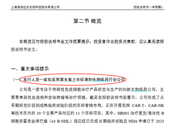 恒润达生的招股书称,公司是一家拟采用第五套上市标准的生物医药行业公司。