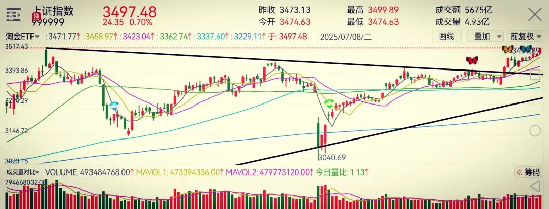 今日A股市场交投活跃,两市成交额达14540亿元,较昨日大幅放量2453亿元。指数距3500点仅差0.11点,高开之际量能同步释放,整体氛围较7月4日更为积极,上涨个股超4000家,赚钱效应显著。